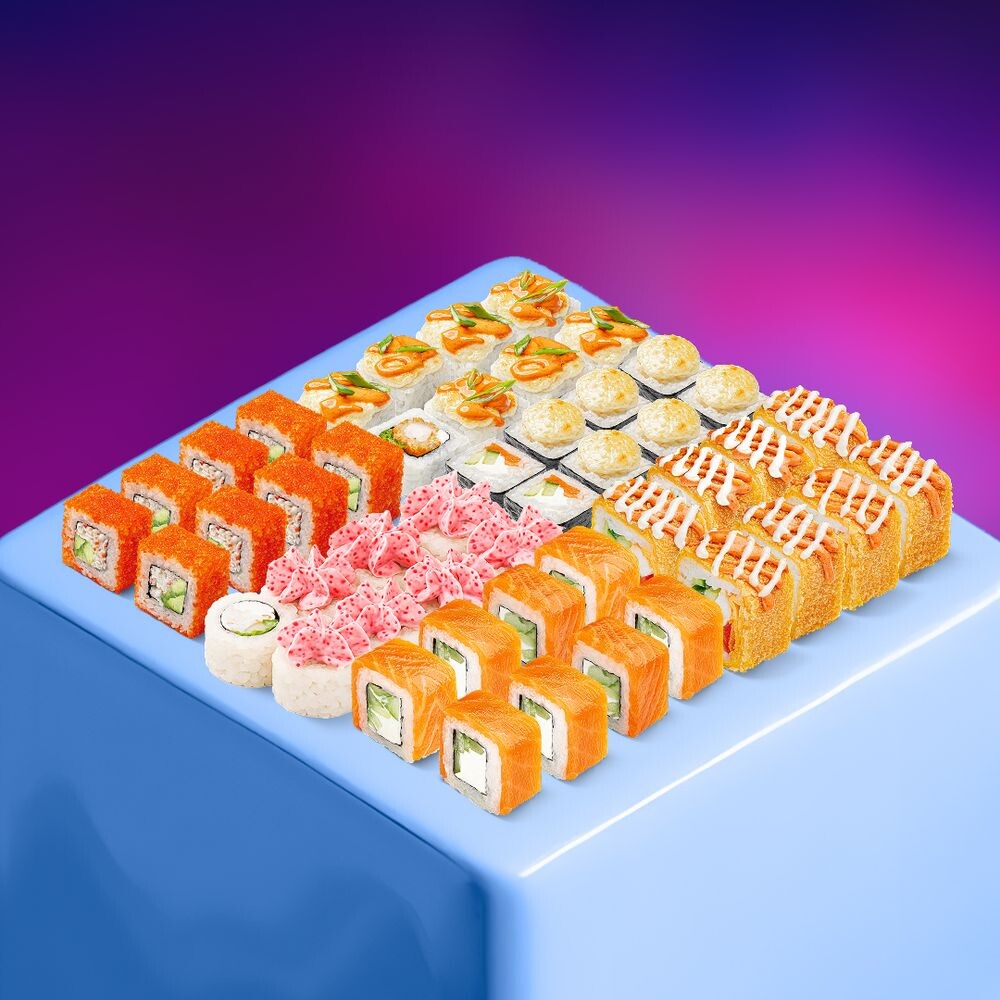 Ты + вторая половинка + набор роллов с рыбой и морепродуктами = вкусный вечер. Состав: Цезарь BIG, Лава эби, Калифорния, Запечённый с лососем, Запечённый эби спайс, Филадельфия с огурцом.