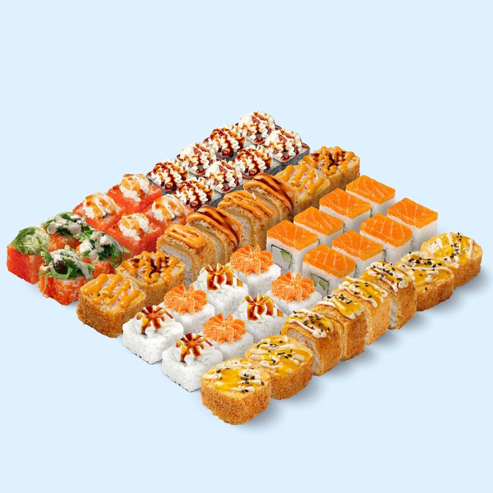 Этот размер в ладошку точно не поместится. Так что освобождай стол для большого сета с морепродуктами. Состав: Чук и чиз ролл, Филадельфия лайт, Сочный краб терияки, Лава краб, Краб темпура, Тортилья с курицей и чили-ананас