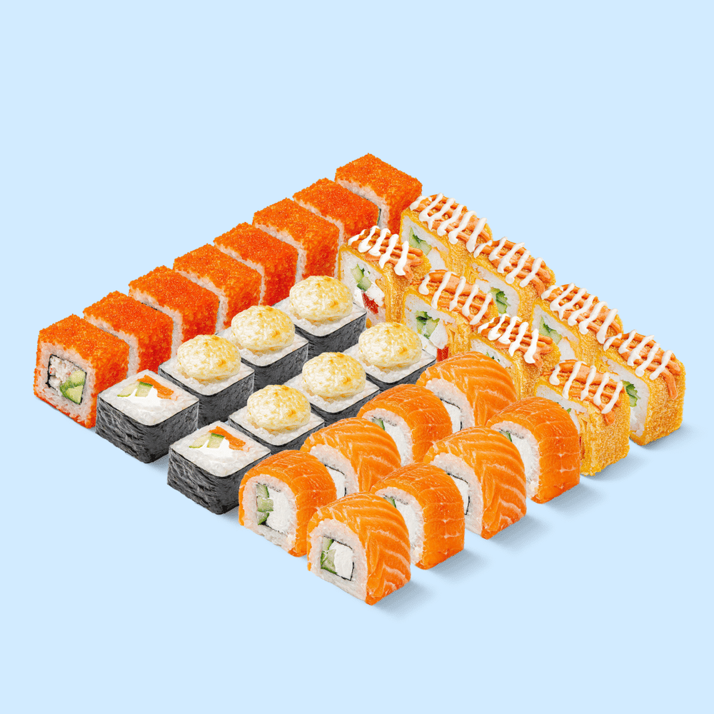 Бескомпромиссный набор роллов, который рвётся в твой рот. Открой пошире! Состав: Калифорния, Цезарь BIG, Запечённый с лососем, Филадельфия BIG