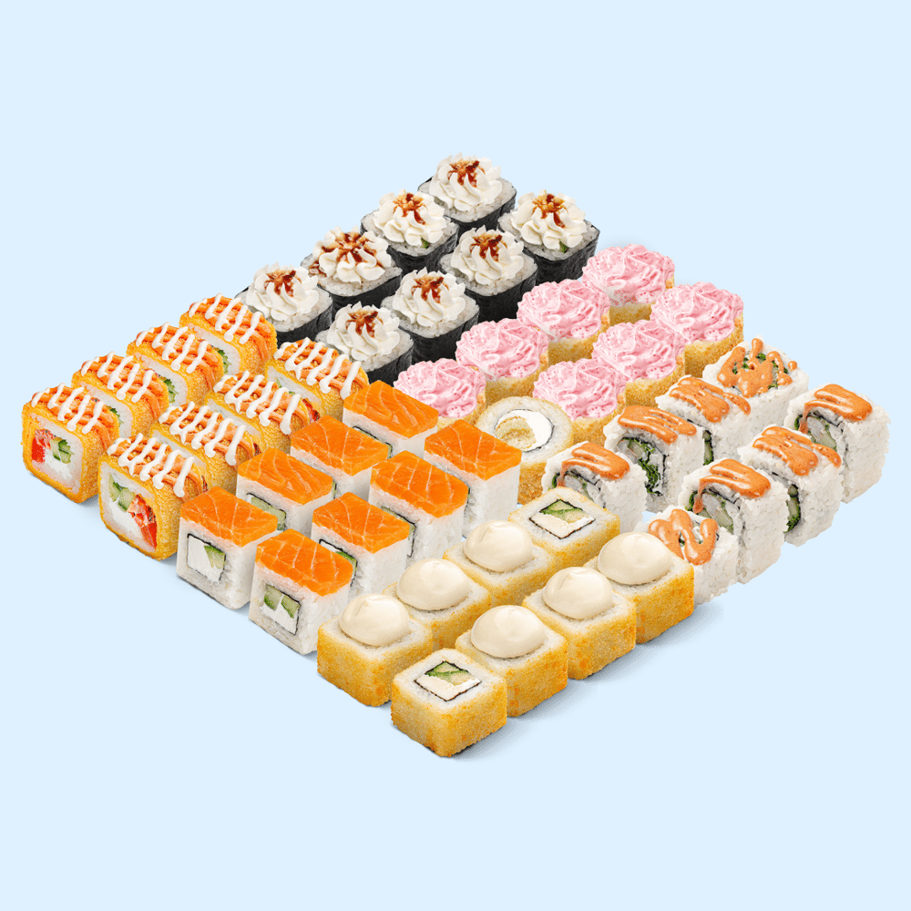 Куни Ли легендарный 6 видов роллов с начинкой из лосося, морепродуктов и курицы. В составе: Цезарь темпура, Лава темпура, Цезарь BIG, Филадельфия лайт, Краб терияки, Киото