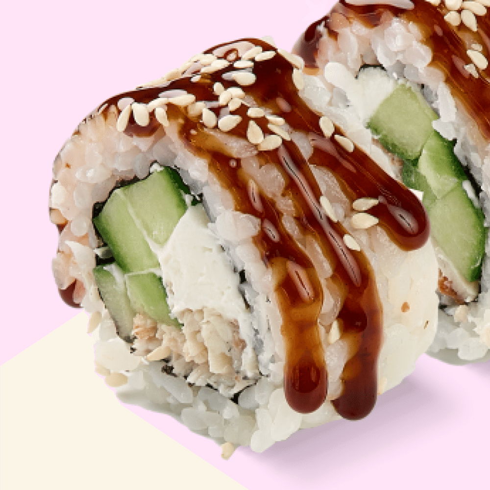 Рис, мицукан, сахар, комбу, соль, нори, сыр сливочный, огурцы, угорь, кунжут, соус унаги