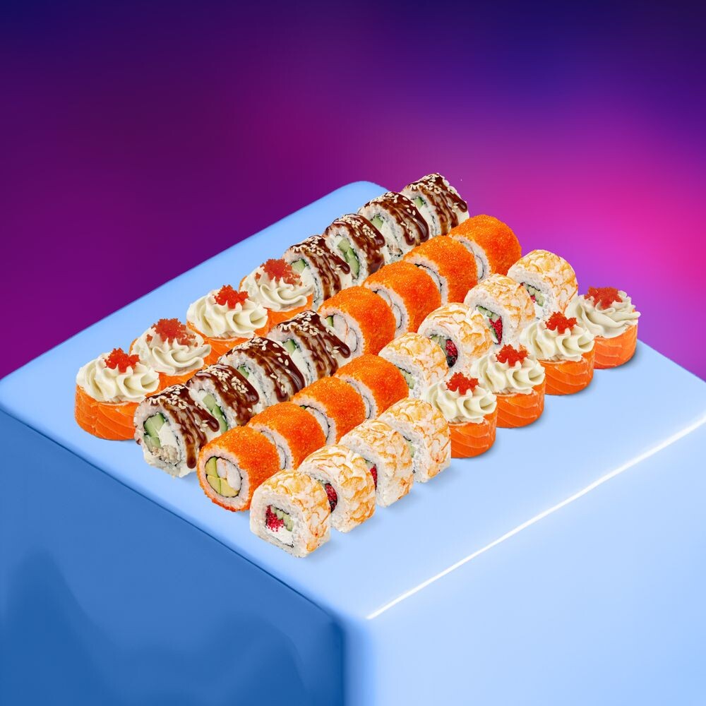 Побалуй себя набором роллов с лососем, морепродуктами и икрой. Состав: Филадельфия "Роял", Флорида, Манхэттен, Калифорния эби