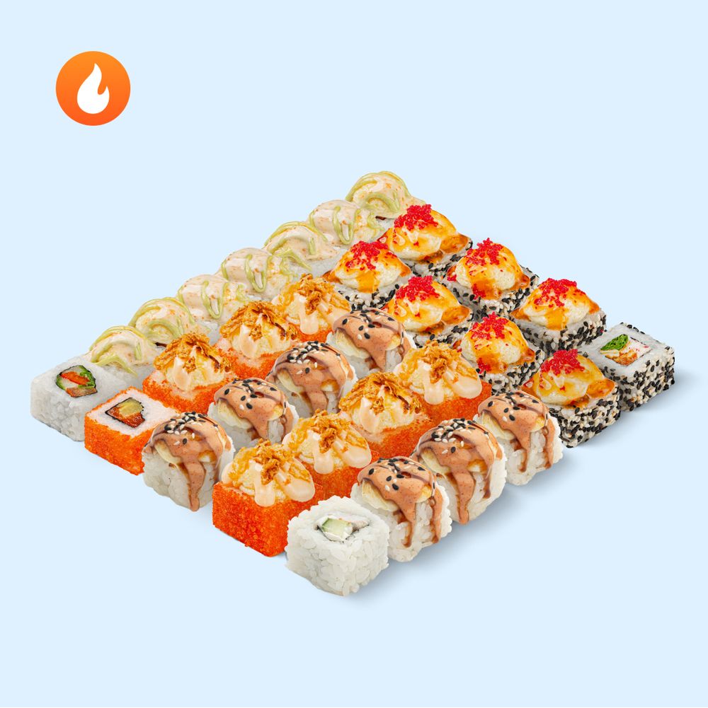 Сет для горячей вечеринки: рыбы и морепродуктов хватит на пятерых.Состав: Запечённая филадельфия с лососем, Запечённый с креветкой и угрём, Запечённая филадельфия с лососем и крабом, Веган-микс