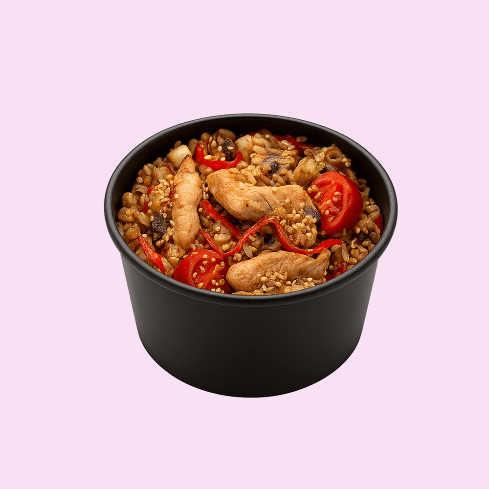 Рис, филе куриное, перец болгарский, лук зелёный, шампиньон, соус пад тай, соль, помидоры черри, кунжут белый