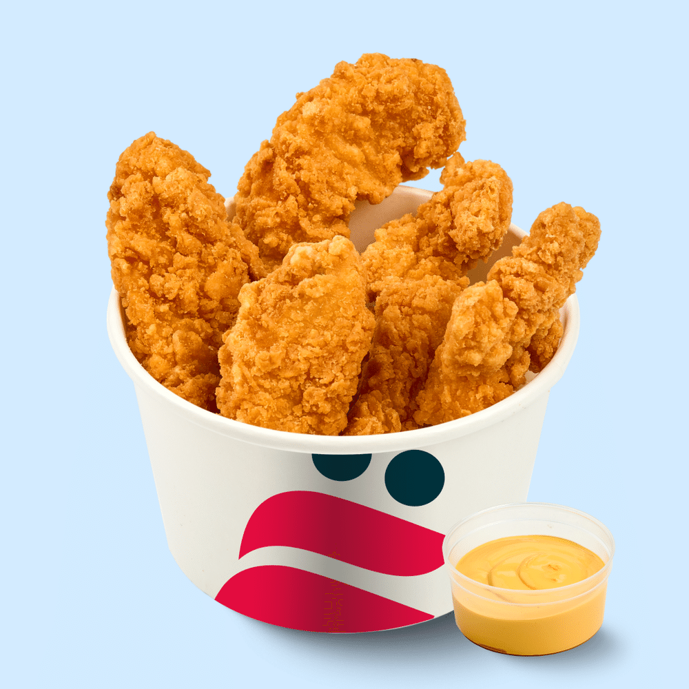 Хрусти и наслаждайся! Куриные стрипсы и сырный соус — бери на вкусный киновечер. Состав: стрипсы, соус сырный.